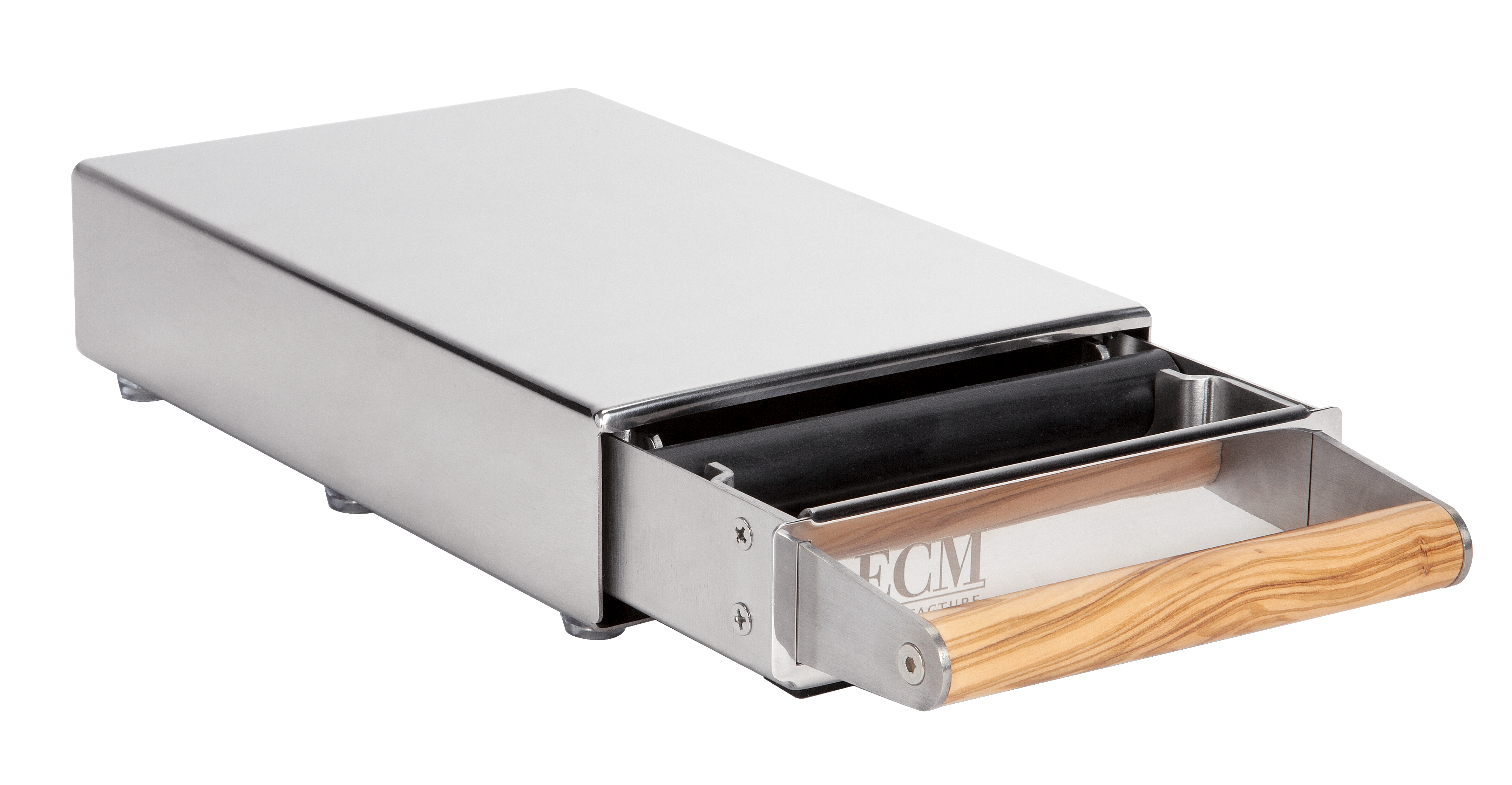 Stylish drawer for disposing of coffee grounds. Featuring the elegant ECM logo on the front and a precise laser-cut inscription on the back, it is both functional and a visual highlight in any coffee station.